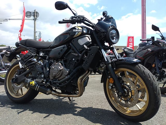 2024年8月に当店よりお買い上げ頂いたXSR700が下取り車両で入荷しました。走行距離が1,555kmと少なく、屋内保管でしたのでツヤツヤで使用感が感じられないキレイな車両です。しかもY’sギアパーツ、アフターパーツがいくつか装着されています。まず目を引くのがARROW製フルエキゾーストマフラー、車検対応なので安心してサウンドが楽しめます。車体の軽量化にもひと役、そしてパフォーマンスダンパー、走行時の車体の変形及び振動をダンパーで減衰させ、ワンクラス上の上質な乗り心地を提供します。スポーティーな印象を与えるメーターバイザー、360°のグリップヒーター寒い日は勿論、突然の雨で濡れた手を乾かしてくれます。独特な形状の高品質なフラットシートは足つき性も向上、そして便利なETCなどが装着されています。車体色のブラックメタリックXは人気のカラーでしたが2024年で生産終了となっています。そんなお買い得感満載なXSR700は如何でしょうか