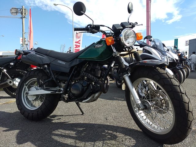 見つけました!店頭販売に自信ありのGood Condition YAMAHA SR400 が入荷しました。ファイナルエディションと同型の5型になりますが、5型はトルクがUPされマフラー出口の口径が大きくなっており、排気音が太く歯切れ良い音が魅力的ですが、程度の良い個体が少なくなってきた印象です。それはファイナルEDも例にもれず同じ状況になっております。そんな中、納得の1台を仕入できました。しかも、ヤマハ純正オプションパーツのモデレートスクリーンとリアサイドガーニッシュⅡが装着されています。まず、モデレートスクリーンはSR400専用に作られた小ぶりなスクリーン、取付けステーもSRに合わせ専用設計にすることで、SRスタンダー車のイメージを崩さないデザインです。スクリーンステーには、メッキの金属チューブを使用し、スクリーンの効果だけでなく、メーター周りをオシャレに演出します。リアサイドガーニッシュⅡはSR400の左右リア周りをオシャレに演出し、振り分けバッグ等の取付時にはサポートバーとしても機能します。